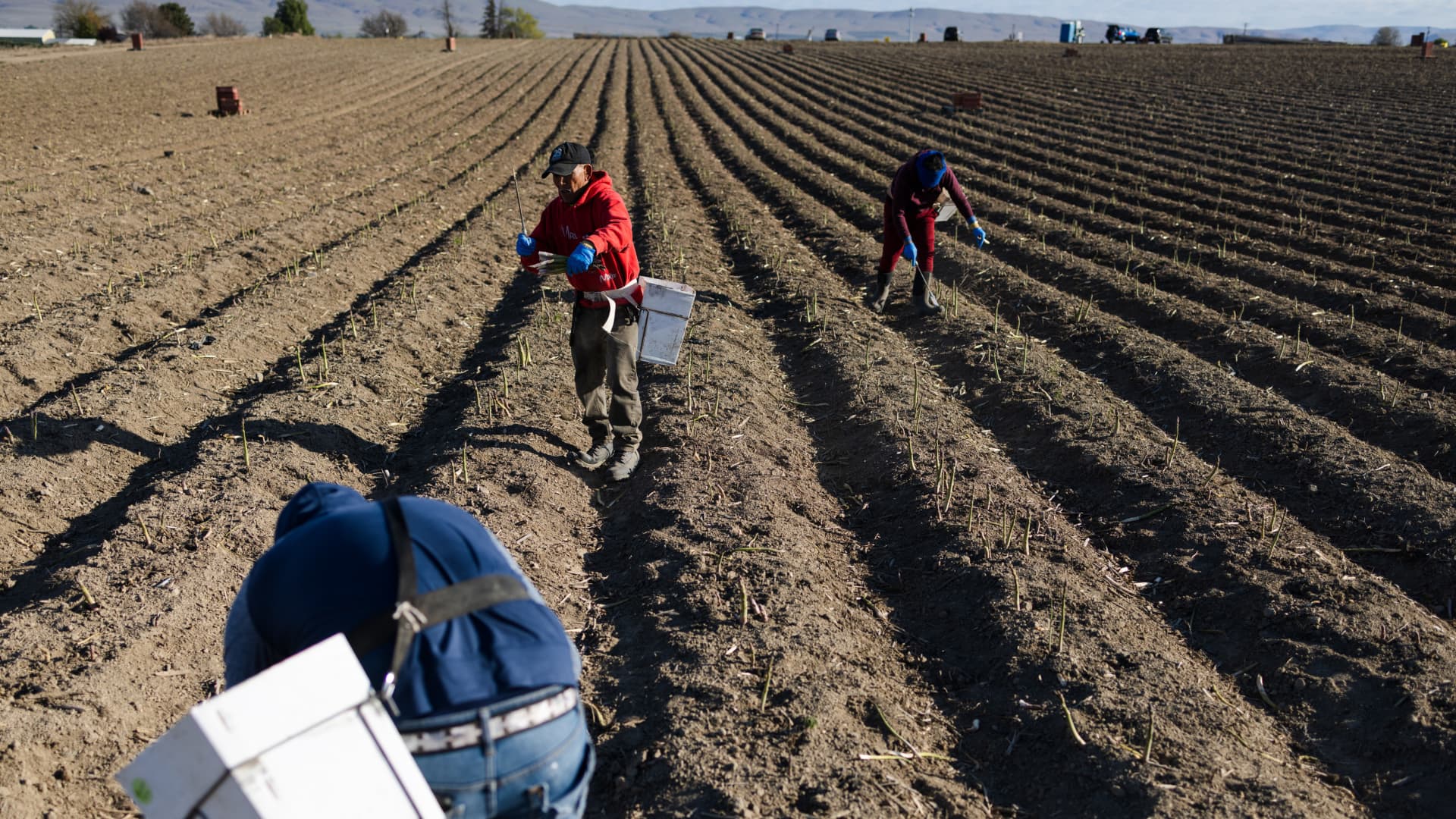 A crane unloads peas imported from Canada at the Laizhou port area of Yantai Port in Yantai, China, Feb. 28,…